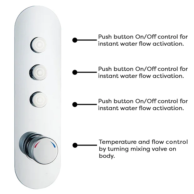 Bring elegance to the modern bathroom with this Arezzo Chrome Industrial Style Push Button 3 outlet complete shower. The package includes a concealed push button shower valve with integrated diverter, handset, fixed overhead shower head and 4 round body jets. The stylish concealed shower valve offers thermostatic showering via three easy-to-operate controls, operates two shower accessories separately or simultaneously and diverts to a third option. The solid brass construction makes the valve durable and quick to clean thanks to the smooth finish. The ideal solution for multi-option showering.