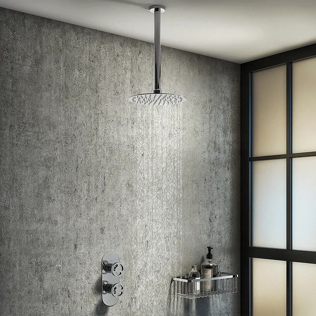 This Arezzo chrome industrial-style round concealed thermostatic valve features a stripped-down aesthetic with round knurled textured tap heads, perfect for creating an eye catching industrial look in your bathroom. Offers thermostatic showering via two easy-to-operate controls for temperature and flow. The valve body comes with a contemporary curved face plate and has been constructed from solid brass. Supplied with matching ceiling mounted polished chrome round fixed shower head with swivel joint and arm.