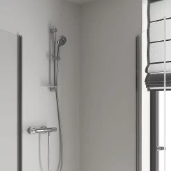 The Grohe Precision Feel Thermostatic Shower Mixer 1/2″ with Shower Set is the perfect upgrade to the comfort of thermostatic showering. GROHE CoolTouch technology ensures that the entire outer surface never exceeds your preferred shower temperature. This safety measure is especially useful for children, who can not always judge whether something they touch is dangerously hot. The shower handset features 3 spray patterns while with GROHE QuickFix, the upper bracket is adjustable for adaption to existing drilling holes.