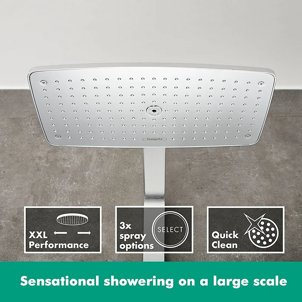 The hansgrohe Raindance E Thermostatic Shower Mixer is an all-in-one shower system that offers an indulgent showering experience. It combines a large square overhead shower and shower handset with 3 spray patterns. The integrated glass shelf offers practical space for shampoo and shower gel bottles. Easy to maintain, the shower head’s QuickClean nubs detach limescale deposits to keep its spray powerful each and every time.