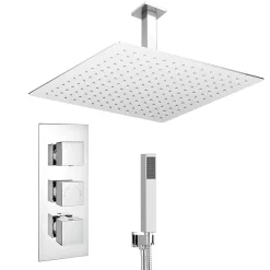 The Milan modern square 3 outlet shower package brings substantial elegance to the modern bathroom. The triple valve enables you to select the fixed rectangular shower head which has two functions ‘Rain effect or waterfall effect’ combined in the one head making it quite unique and 6 body jets which are perfect for creating a shower that massages you. Suitable for all types of plumbing installation this shower valve has the added safety benefit of a built in anti scald device should the cold water supply fail.