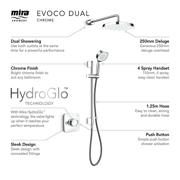 Ultra-sleek and fully-concealed, the Mira Evoco Dual Outlet Chrome Thermostatic Mixer Shower creates a refined, sophisticated look and feel. Enjoy style as clean and luxurious as your experience – featuring a fully-concealed shower mixer and indulgent double spray heads. With innovative Mira HydroGlo technology, illuminating at the perfect temperature.