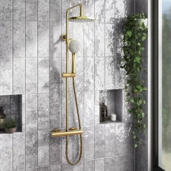 Arezzo Shower Bath – 1700mm L Shaped With Brushed Brass Screen + Matt Blue Panel