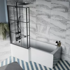 Arezzo Shower Bath – 1700mm L Shaped With Matt Black Grid Screen + Panel