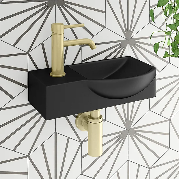 The space-saving Valencia mini matt black wall hung basin, a high-quality offset ceramic basin with a single tap hole positioned on the left-hand side. Provides you with a handy space-saving solution for your cloakroom or en-suite.