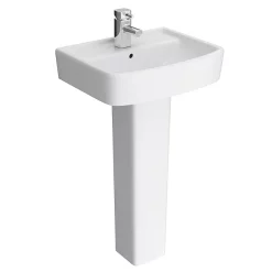 The modern Venice 1 tap hole corner basin and pedestal, it’s contemporary elegant soft lines and compact size make it ideal for smaller bathrooms and en-suites; made from high grade ceramic with a smooth cool white finish. Comes with a full pedestal.