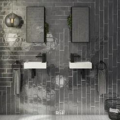Victorian Plumbing Rondo Double Wall Hung Basin Package With Matt Black Square Taps + Bottle Traps